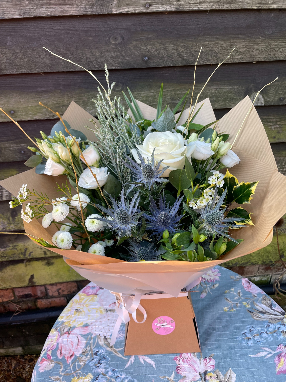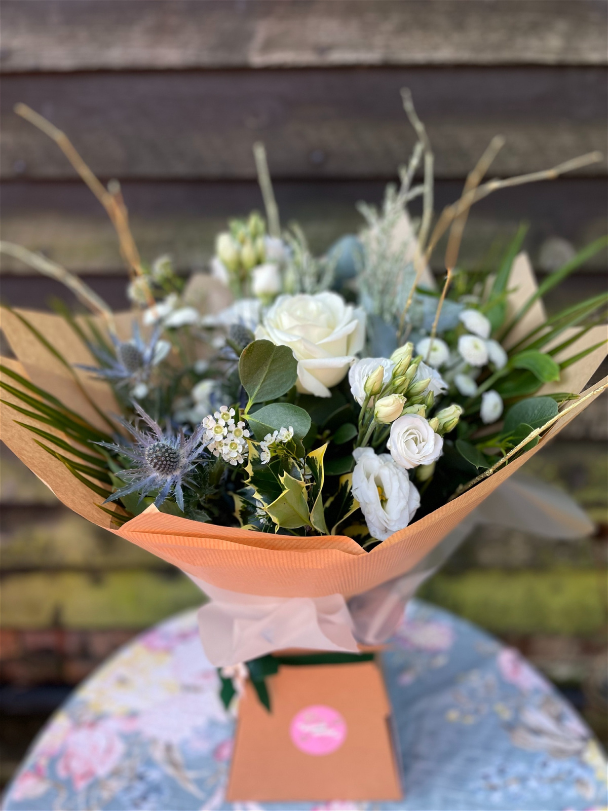A selection of hand tied seasonal flowers in shades of white and ivory mixed with seasonal scented foliage such as pine and eucalyptus. Wrapped in Kraft paper and delivered in water. Available in two sizes.